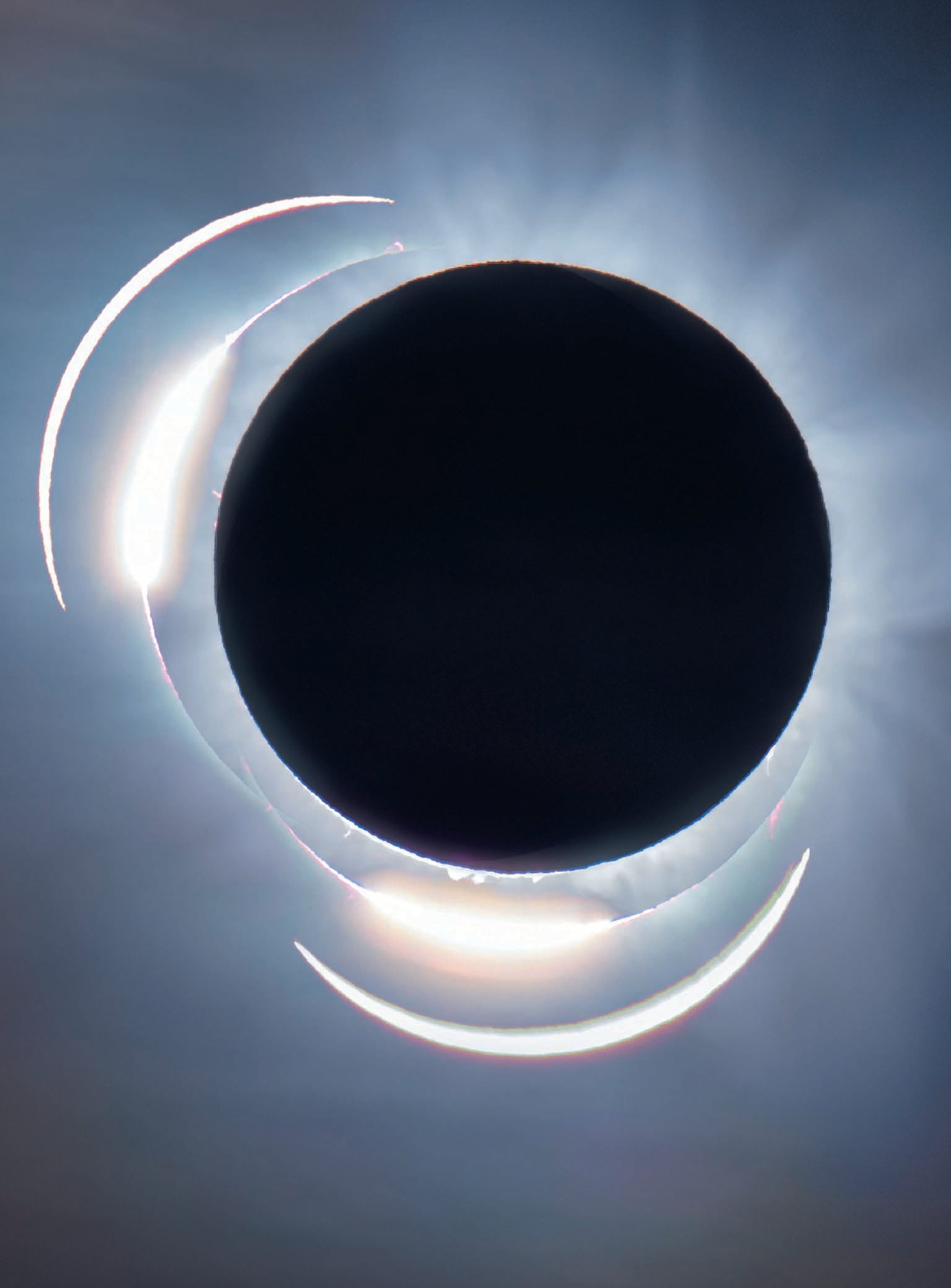 A composite view of the November 2012 total solar eclipse seen from Australia shows totality in the center, along with the “diamond ring” effects created just before and just after the moon completely covers the sun’s face, as well as two thin “crescents” from moments slightly earlier and later. Credit: Alan Dyer